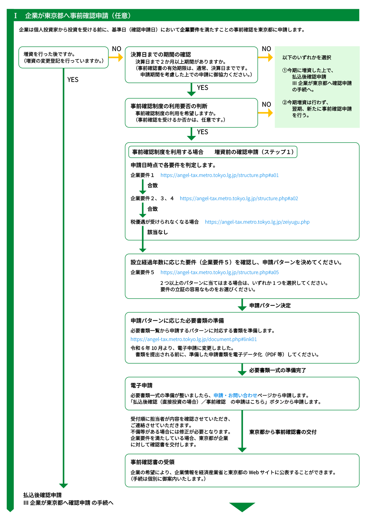 | Ⅰ | 企業が東京都へ事前確認申請(任意。増資後のときは不要) | ●決算日までの期間の確認 ●事前確認制度の利用要否の判断 ●事前確認申請の要件確認 | 企業 |