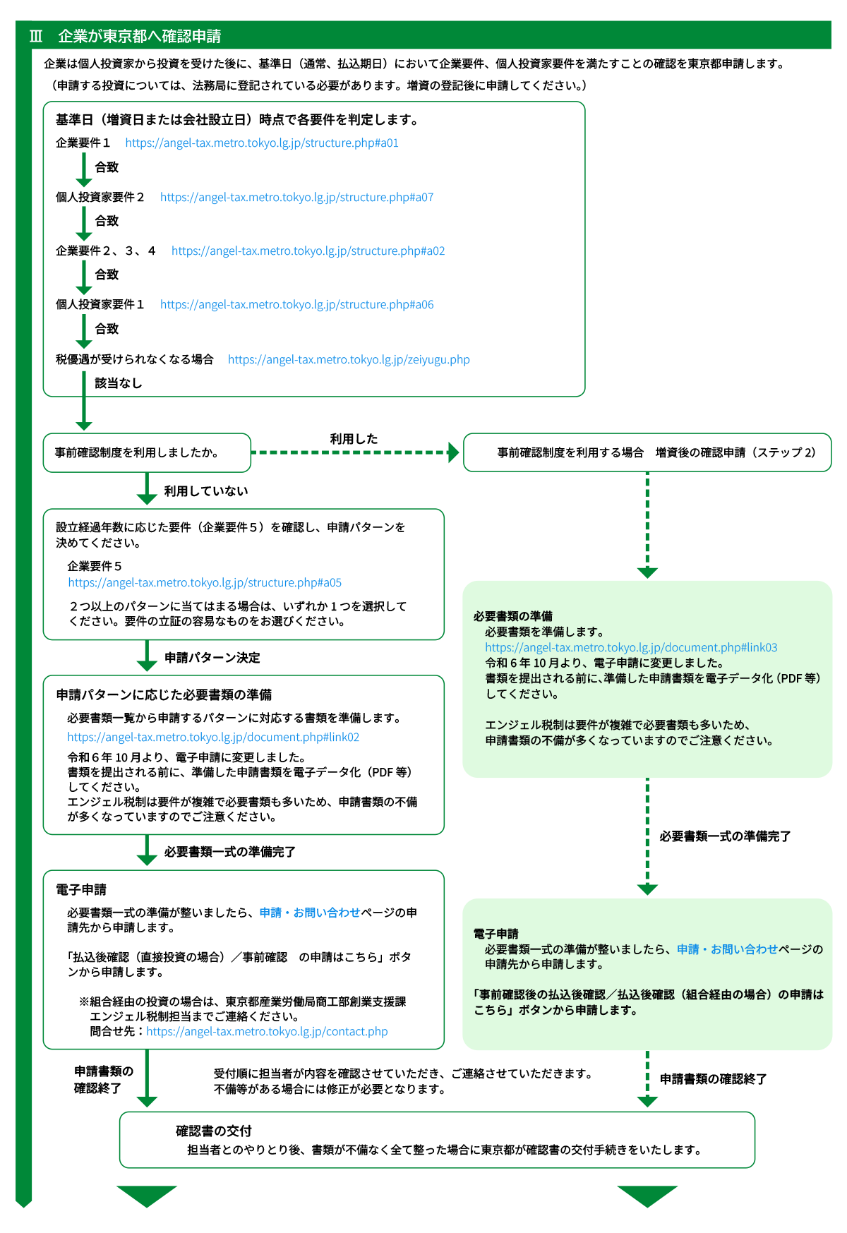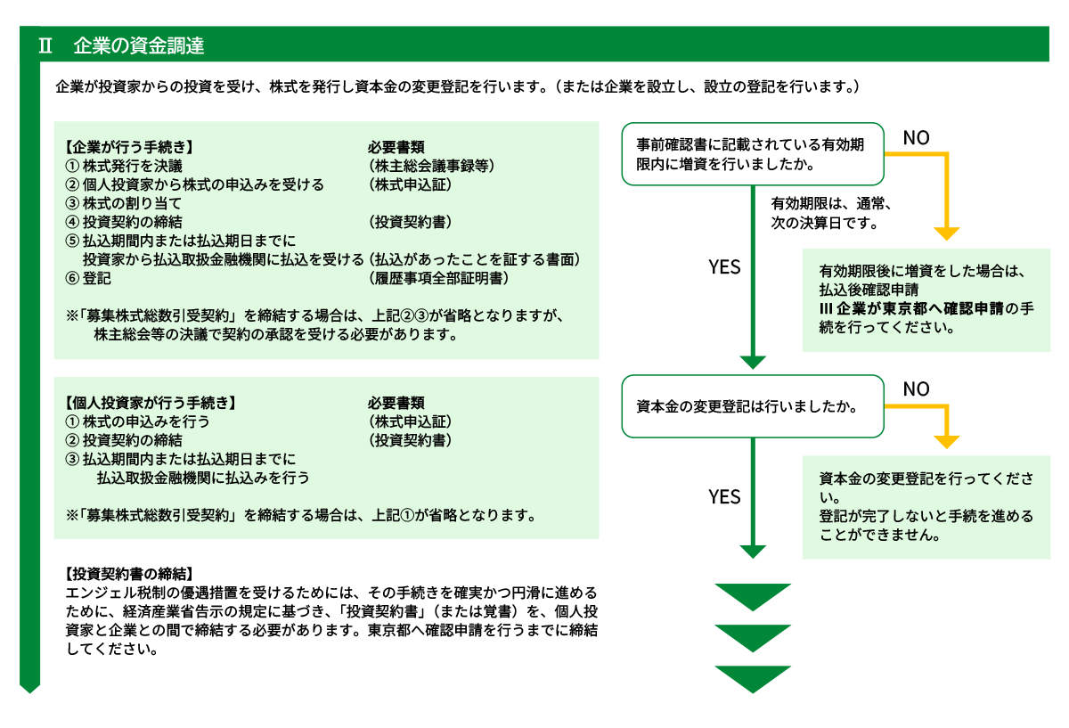 エンジェル税制の申請は、企業が本店所在地の東京都に対して行います。基準日において要件をすべて満たしている場合、東京都が企業に対して確認書を交付します。