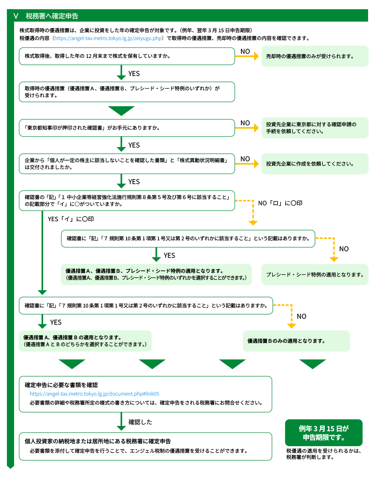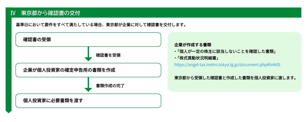 | Ⅳ | 東京都からの確認書の交付 | ●確認書の受領 ●企業が確定申告用の書類を作成 ●投資家へ必要書類を交付 | 企業 |